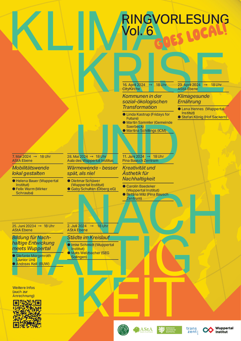 In addition to the need to adapt to the consequences of climate change, cities face many other challenges. This is noticeable, for example, in the delayed mobility and heating transition or the tight housing market. Against this backdrop, transzent, the AStA of the University of Wuppertal, Students for Future Wuppertal and the Wuppertal Institute invite you to the sixth edition of the lecture series Climate Crisis and Sustainability. On seven dates, speakers from the world of research and experts from the field will shed light on various dimensions of urban transformation processes.