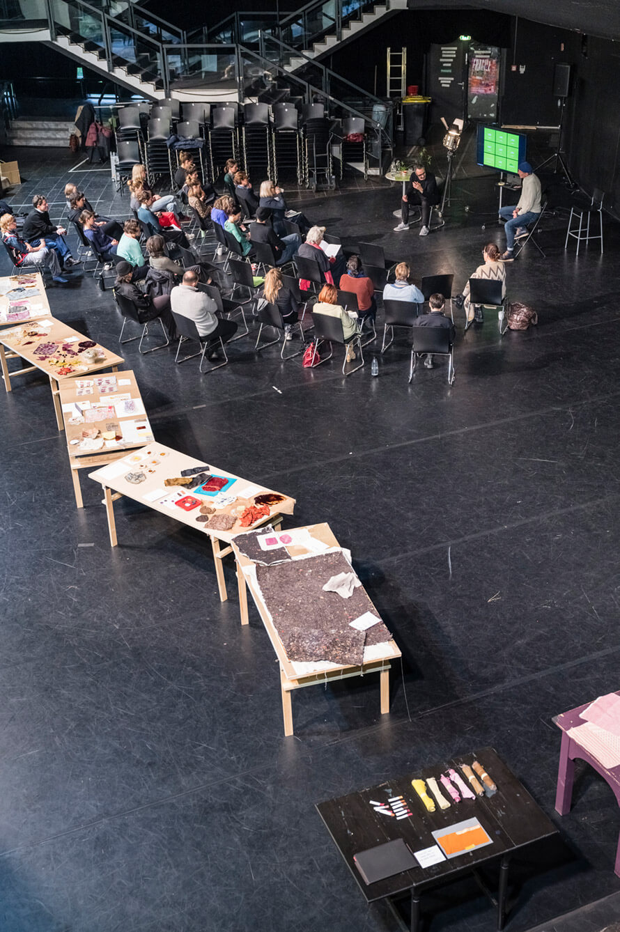 SOMETHING NEW – Neue Materialien erkundete im kollaborativen Ansatz, gemeinsam mit Theaterschaffenden und anderen Expert*innen aus Kunst, Wissenschaft und Handwerk, neuartige Biomaterialien, die für das Theater relevant sind. Die Veranstaltung bestand aus konzeptionellen Workshops mit wechselnden Expert*innen wie Dr. Tanja Beer & Freddy Komp (Griffith University Queensland Australia), Friederike Hoberg (TU Berlin), Sarah Meyers (MeyersFügmann Berlin), Irene Purasachit (Flower Matter, Designerin), Dr. Emilija Veselova (Forscherin, Designerin), Axel Wähling (NIG Natural Dyes), Anja Gast (Gewandmeisterin/Kostümbildnerin) und Barbara Zippel (Pflanzenfarben Manufaktur).