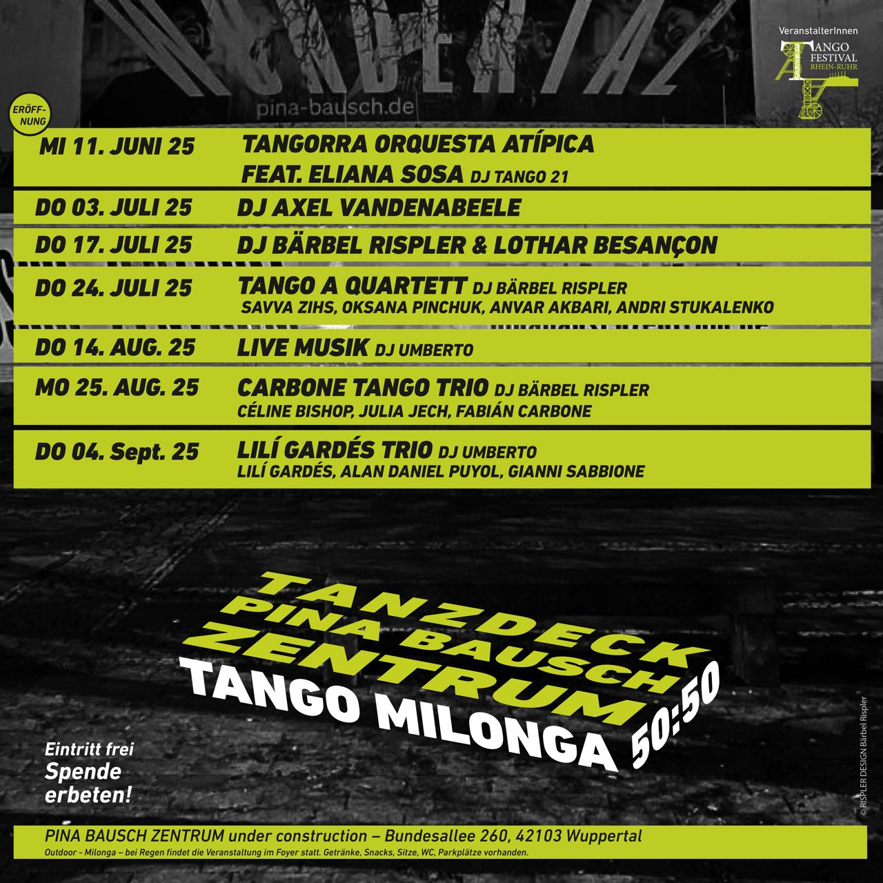 Die Veranstaltungsreihe geht mit 4 weiteren Terminen bis Do, 04.09. 2025 und wird vom TANGOFESTIVAL RHEIN RUHR organisiert.