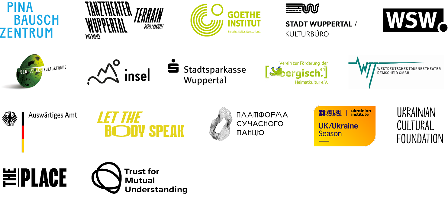 Das Projekt entstand in Zusammenarbeit mit der Contemporary Dance Platform (Ukraine), The Place (United Kingdom), gefördert vom British Council, der Ukrainian Cultural Foundation und dem Trust for Mutual Understanding (USA). Unterstützt vom Kulturbüro Wuppertal, der Stadtsparkasse Wuppertal, dem Bergischen Kulturfonds, dem Verein zur Förderung der Bergischen Heimatkultur e.V. und INSEL e.V. Die Vorstellung im Schauspielhaus wird unterstützt im Rahmen des Projektfonds Ukraine des Goethe-Instituts, gefördert durch das Auswärtige Amt zur nachhaltigen Stärkung der Resilienz der ukrainischen Kultur- und Bildungspartner.